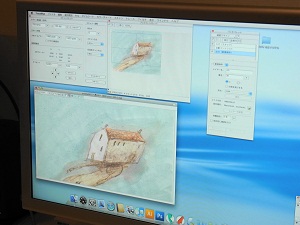 次に描いた絵を、スキャナーでコンピュータに取り込みます。スキャナーは、思った以上に小さなものでした。位置を固定するために、左端にタップが貼付けてあり、そこに穴をあわせるよう工夫されています。