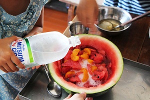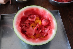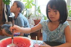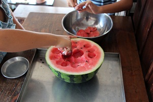 計量スプーンをつかって、スイカの実を丸くくり抜いていきます。