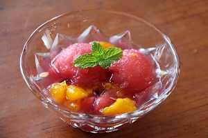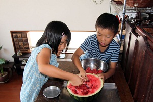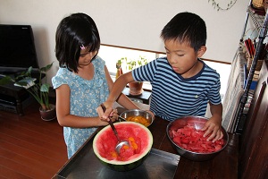 右田一家は日本家屋で暮らしているのですが、そこにはトラックで八百屋さん(大沢くんのおじいちゃん)がやってきます。まん丸のスイカをまるごと買って、縁側で食べる。私にとって憧れの夏休みの風景がそこにはあるのです。スイカはそのままで食べるのが一番と思われる方も多いかもしれませんが、今回は子どもの頃、母に作ってもらうと本当にうれしかったスイカのポンチを作ります。夏休みスペシャルということで、私の甥の悠飛(ゆうひ)と姪のりん、従兄妹同士の二人に作ってもらいます。