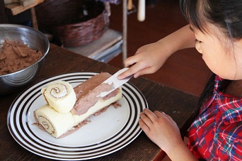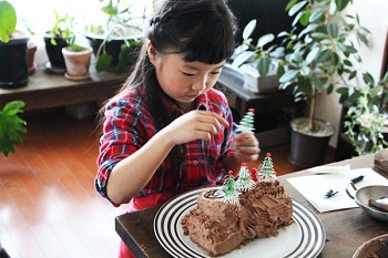 師走のこの時期、忙しくてケーキを一から作る気にはなれないと思うので、今回は思いっきり手を抜いて、子どもと一緒にロールケーキを使って「ブッシュ・ド・ノエル」のデコレーションに挑戦してみましょう。今回一緒に作ってくれるのは、近所に住んでいる7歳のみーちゃんこと、麻由美ちゃんです。