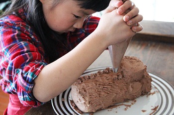 チョコクリームを絞り袋に入れて、デコレーションを始めました。まるで職人さんのようです。チューブチョコで年輪も描きました。お皿についたチョコクリームはふきます。