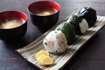 お皿に変わりむすびを盛りつけて、たくわんを添え、あたためたお味噌汁をお椀につけたら、出来上がりです。