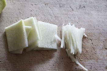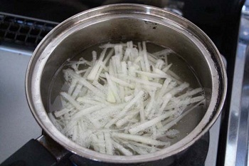 煮干しの入った水を弱火にかけ、沸騰する直前に火をとめて漉します。お出汁をお鍋に戻して火をかけて、大根を加えます。