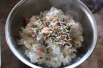 まずは手をきれいに洗ってから、ご飯は蒸らし立てのアツアツの時に、おむすびにしていきます。まずはサケじゃこふりかけをまぜます。手に水と塩をつけて握っています。あまり強くにぎりすぎないように。