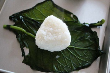 次は塩むすびを作って、広げた野沢菜の上にのせ包みます。
