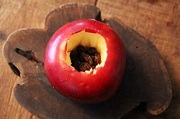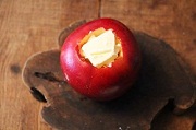 穴の中に干しぶどう、砂糖、シナモンパウダー、バターの順に詰めていきます。中で混ざるので、バターを上にすると全体に味がしみわたります。