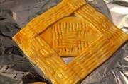パイシートを魔女の鏡の枠に見立てて、ひし形に組み合わせます。好きな形にしてみてください。フォークで筋を付けていきます。境目をくっつけるように。卵黄をほぐしてパイシートに塗ります。