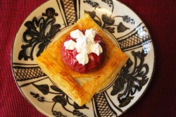 リンゴとパイが焼きあがったら、お皿に盛り付けを。パイの上にリンゴを置き、あとは生クリームでデコレーション。お子さんと一緒に楽しんでみてください。