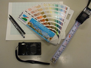 安宅さんがいつも持ち歩いている七つ道具。方眼紙、色見本帳、メジャー(メーターの他に尺寸がついている特別なもの)、カメラ。