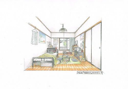 全体のコンセプトをさらに監督とすり合わせたら、撮影場所を探します。今回安宅さんが美術を担当した『横道世之介』の主人公・世之介のアパートは、5~6件をリサーチして撮影のしやすさや窓から見える風景などで決めたそうです。次に登場人物の部屋のスケッチや図面を仕上げていきます。これにもとづいてスタッフが、部屋に置くベッドや装飾品を調達します。