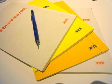 コンストラクションと呼ばれる作業があり、ひとつの場面の中でどんなことを表現するかを決める箱書き、そしてセリフ、ト書きが入って脚本になっていきます。監督と話し合いを重ね、第1稿、第2稿となんども修正をしていき、撮影用の決定稿を作り上げます。