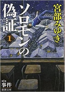 「ソロモンの偽証」第1部 事件 上巻(新潮文庫刊)今や10代の子どもたちの自殺や、家庭内暴力による死亡といった事件は、日本各地で連日のように生じており、変な言い方ですが、そうしたニュースに私たちのほうも慣れてしまった気がします。でもよくよく考えると、「ソロモンの偽証」に描かれているような、いじめや不登校、親に理解されない子どもの苛立ち、育児放棄をする親、家庭内暴力の鬱憤を弱い者いじめで発散する不良、事件をセンセーショナリズムの視点でしか報道しないマスコミ、真偽を確かめもせず噂を信じこむ人々といった様相は、既に30年ちかく前から始まっていたのです。それどころか、我われを取り巻く現代社会の諸問題は、インターネットやスマートフォンの普及、SNSの発達により、より一層、複雑化しているのではないでしょうか。