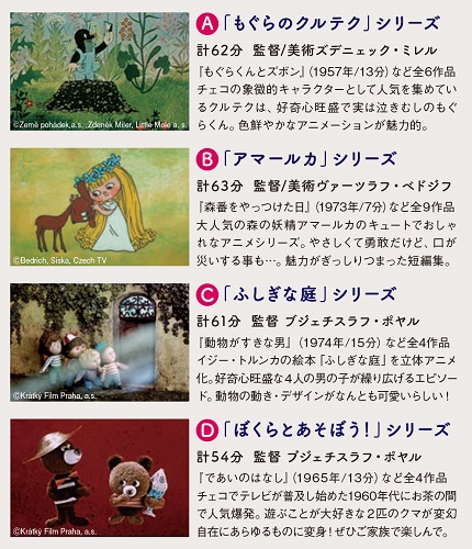 チェコで初登場第1位、「トイ・ストーリー3」を上回る大ヒットを記録した、ヤン・スヴェラーク監督の「クーキー」をメインに、「クルテク」、チェコアニメーション界の巨匠・イージー・トルンカ監督の「真夏の夜の夢」「バヤヤ」など、チェコの名作アニメーション8作品を集めました。